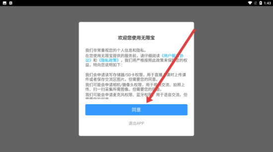1、在无限宝用户协议弹窗点击同意,进入登录界面,开启账号登录流程。