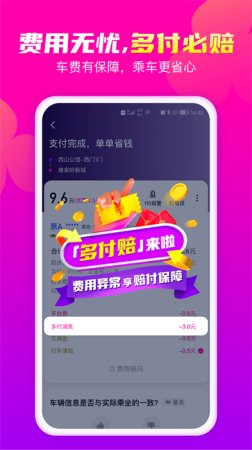 3、推出多付赔无忧体验:可解决费用异常问题,让车费有保障,用户乘车更省心。