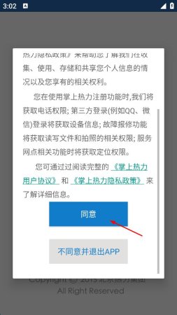 1、打开掌上热力APP,出现隐私政策相关界面,仔细阅读后点击“同意”,进入主界面。