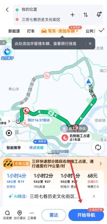 3、在路线规划的界面,选择出行方式如驾车,点击右下角的开始导航按钮,即可开启导航。