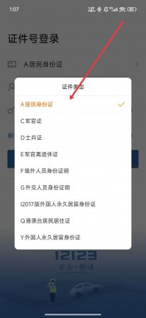 3、在选择证件类型中,点击选择使用居民身份证用来登录。