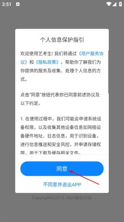 1、打开艺考生APP,会弹出个人信息保护指引窗口,阅读后点击“同意”按钮,进入APP主界面。