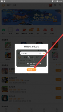 1、在遇到破解游戏下载方法提示弹窗,通过点击我知道了关闭,继续浏览应用内游戏资源。