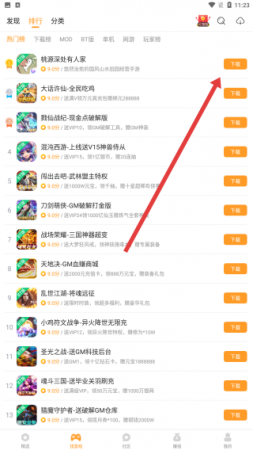 3、在游戏排行列表中找到目标游戏,可以按照箭头指示点击其右侧下载按钮,启动游戏下载流程。