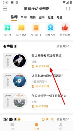 2、在书苑界面的推荐栏目下,找到有声期刊板块,选择想要听的期刊,比如点击尚舞2025年15期。