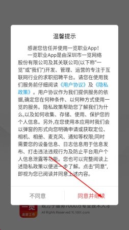 1、打开一览职业App,在弹出的温馨提示页面,点击同意并继续。