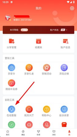 2、在个人页面下方找到自助工具板块,点击其中的在线客服选项,进入与京东联盟客服的对话界面。