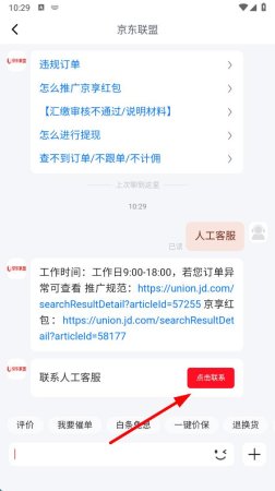4、按照回复提示,点击联系按钮,在工作日的时间段内,即可成功联系到京粉人工客服。