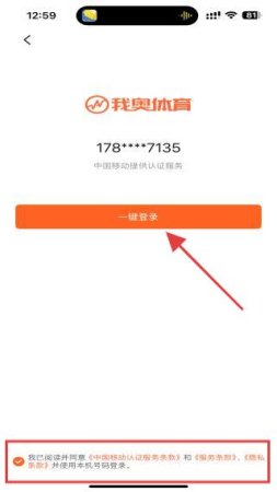 3、勾选页面下方我已阅读并同意中国移动认证服务条款和服务条款、隐私政策并点击一键登录的功能按钮。