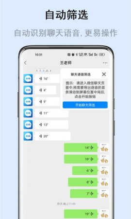 自动语音导出app是一款可以帮助用户导出微信、QQ聊天语音内容的手机应用,以后就可以通过app轻松的整理聊天语音文件了,然后就能将语音文件知道导入本地保存起来,您随时随地都可以收听语音内容。可以适用到许多的场景中,例如:课程语音、网课语音、工作学习等等,能够满足许多使用的使用需求。