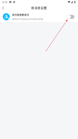 3、在免密支付设置界面,找到想要开启免密支付的方式,比如支付宝免密支付,点击其右侧的开关按钮将其开启,开启后使用对应方式充值云豆时将自动扣款。