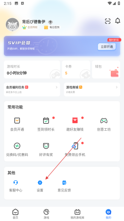 1、打开云电脑应用,点击底部导航栏中我的选项,进入个人中心页面,在常用功能下方找到并点击设置选项。