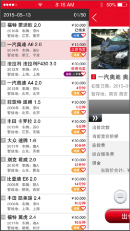 独创的竞拍侧滑边栏,可随时查看和切换本场拍卖会内的任意车辆,掌握竞价情况和了解竞拍进度。