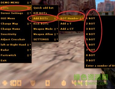 2.然后点击“BOTS”选择“ADD BOTS”可以选择增加机器人数量,以及类别和删除机器人等(add_ct为反恐精英;add_t为恐怖分子)。