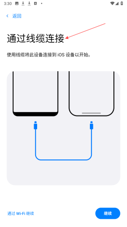 2、若选择通过线缆连接方式就准备好适配线缆,将安卓设备与苹果手机连接起来,连接成功后按界面提示进行后续操作。