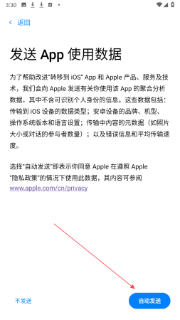 1、在安卓设备打开转移到iOS应用看到发送App使用数据界面后按需选择不发送或自动发送,之后进入连接方式选择界面。