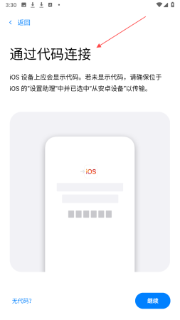 3、要是选择通过代码连接,那就等待苹果手机显示代码,显示后在安卓设备对应界面输入代码,输入无误后按提示完成安卓设备与苹果手机的连接。