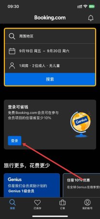 - 输入城市、地标、酒店名称、或寻找附近住宿,轻点一下开始搜索。