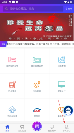 1、打开宜兴享出行APP,点击底部导航栏最右侧的个人中心,进入个人中心页面。