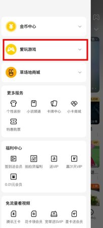2、在弹出的侧边栏菜单中,找到并点击爱玩游戏选项。
