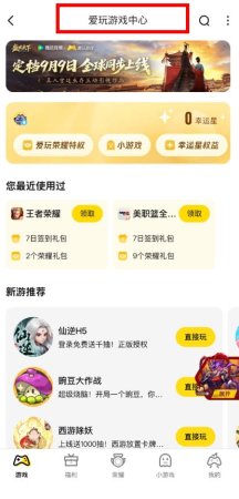 3、进入爱玩游戏中心页面,浏览和使用相关游戏服务。