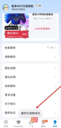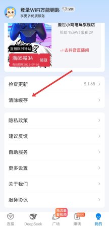 1、打开WiFi万能钥匙,进入我的页面,找到并点击清除缓存选项,触发缓存清理流程。
