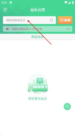 1、打开汕头公交APP,进入主界面,找到顶部的搜索框,点击搜索框,准备输入要查询的线路或站点。