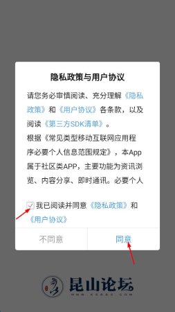 1、打开昆山论坛App,出现隐私政策与用户协议弹窗,勾选已阅读并同意后点击同意按钮。