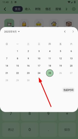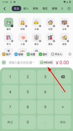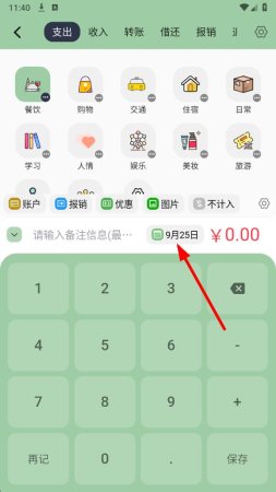 4、选择好日期后,日期变更为目标日期,继续完成记账的其他信息填写及保存即可。
