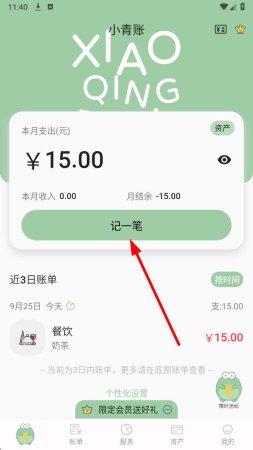 1、打开小青账app,在首页点击记一笔按钮,进入记账页面。
