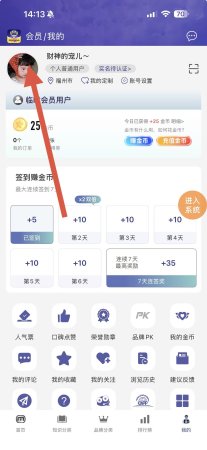 2、在个人页面中,点击头像区域进入会员相关操作界面。