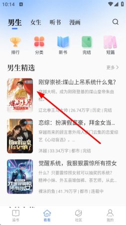 2、在男生精选等板块中,选择想要听的小说,例如刚穿崇祯:煤山上吊系统什么鬼。