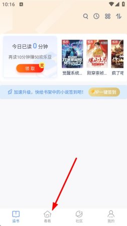 1、打开酷匠阅读APP,点击底部导航栏中的看看进入书籍浏览界面。