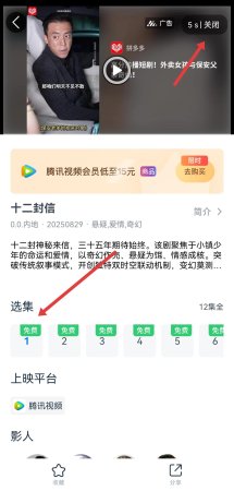 2、在剧集详情页面,等待广告倒计时结束或点击关闭广告,然后在选集区域选择要观看的集数。