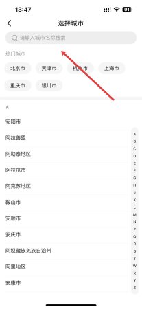 2、进入选择城市页面后,如果目标城市不在热门城市列表中,可以在搜索栏输入城市名称进行搜索定位城市。