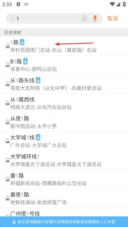 3、在搜索框中输入要查询的公交路线相关信息,如“1路”,在历史搜索或搜索结果中点击对应的公交路线。
