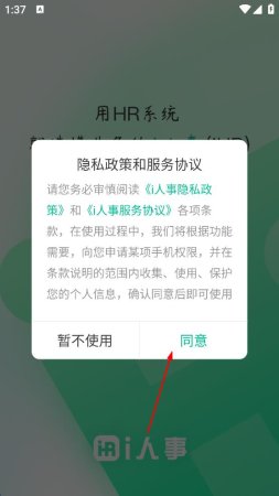 1、打开i人事App,在隐私政策和服务协议页面,点击“同意”按钮。