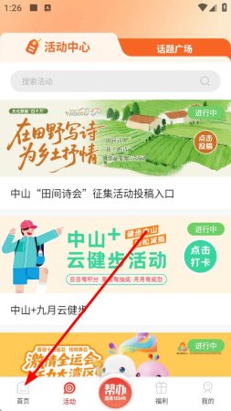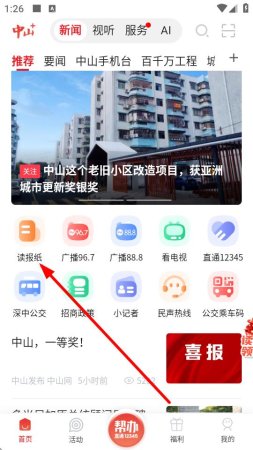 1、打开中山日报app,点击底部导航栏中的首页进入首页界面。