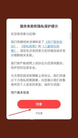 1、打开喜马拉雅APP,在弹出的服务条款和隐私保护提示框中,仔细阅读相关内容后,点击“同意”,进入APP主界面。