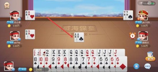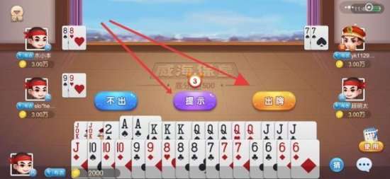 2、进入对局后,手牌区会展示当前持有的所有牌型,当不确定如何出牌时,点击界面中间的提示按钮,系统会基于当前局势给出合理的出牌建议。