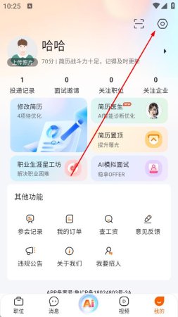 2、在我的页面,点击右上角的设置图标。