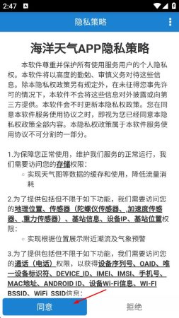 1、打开海洋天气APP,会出现隐私策略页面,仔细查看后,点击“同意”按钮,进入APP主界面。