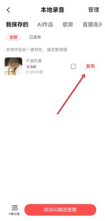 2、在本地录音的列表中,点击要发布的作品右侧的发布按钮,进入作品发布编辑页面。