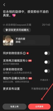 3、在发布编辑页面,填写文字描述,设置同步、曝光等选项后,点击公开发布或私密上传,即可发布录好的作品。