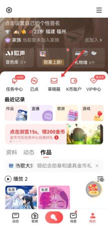 1、进入全民K歌我的页面,需要点击账号的草稿箱,找到已录好的本地录音作品。