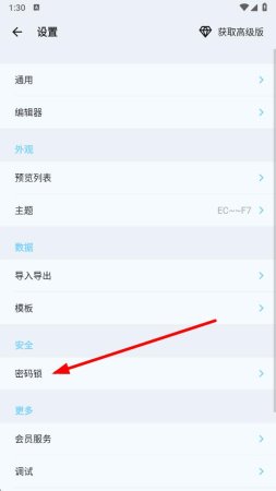 3、在设置界面里,向下滑动找到安全板块,点击其中的密码锁选项。