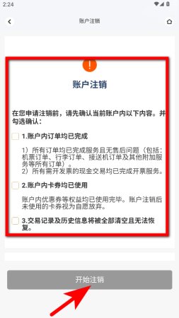 4、在账户注销页面,勾选确认相关条款后,点击开始注销完成账号注销操作。
