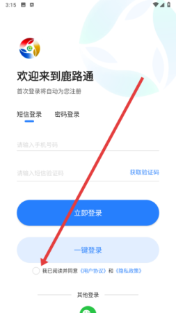 2、在进入到登录页面中,先点击勾选我已阅读并同意按钮后操作。
