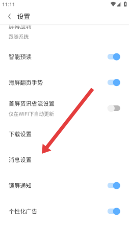 2、在设置界面中,滑动查找功能列表,点击消息设置选项,进入消息通知专属设置页面。