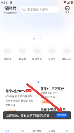 2、进入保险师APP的首页后,需要点击底部悬浮的立即登录按钮,然后跳转至登录的页面。